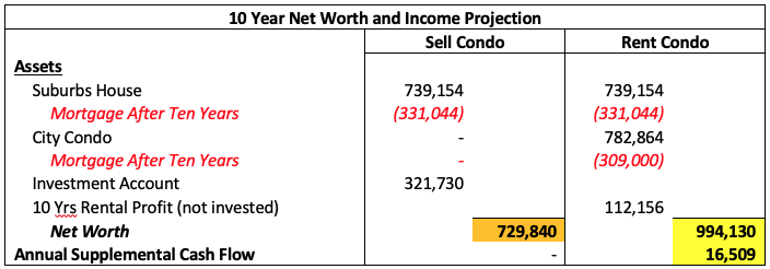 There is no question that the couple is better off financially in the “keep your condo” strategy. Even assuming zero investment growth on the cumulative rental profits, the couple has an additional $265k ($994k - $729k) in net worth and $16.5k in income.