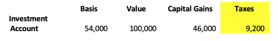 By way of example let’s assume our young couple needs $100,000 dollars ten years after buying their suburban home. If they sold their condo they would look to their investment account for funds. In year ten, the investment account is $321k, with a taxable basis of $175k. That means about 46% of every dollar is considered a long-term capital gain, taxable at a combined federal and state rate of 20%. In other words, accessing $100k would generate about $9,200 in taxes.