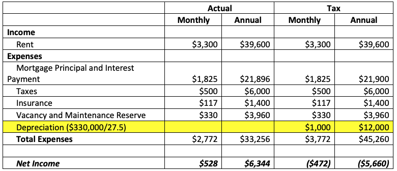 But it gets better because none of that money is taxable in the first year. The property actually has a net taxable loss due to the concept of depreciation (another much-beloved tax benefit of real estate investors that I won’t bore you with). Here’s the comparison of actual vs. tax cash flow for year one.