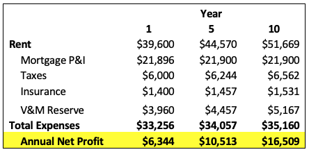 Here are the annual cash flow numbers for years 1, 5 and 10 using the same income and expense growth rate assumptions shown in the table above.